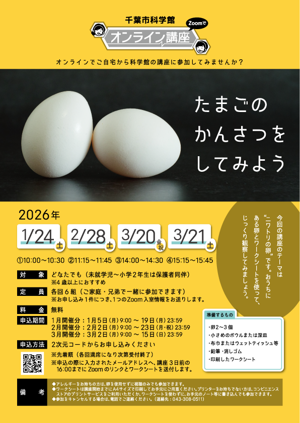 ※アレルギーをお持ちの方は、卵を使用せずに視聴のみでも参加できます。 ※ワークシートは講座開始までにA4サイズで印刷してお手元にご用意ください。 プリンターをお持ちでない方は、コンビニエンスストアのプリントサービスをご利用いただくか、ワークシートを使わずに、お手元のノート等に書き込んでも参加できます。 ※参加をキャンセルする場合は、電話でご連絡ください。(連絡先:043-308-0511)